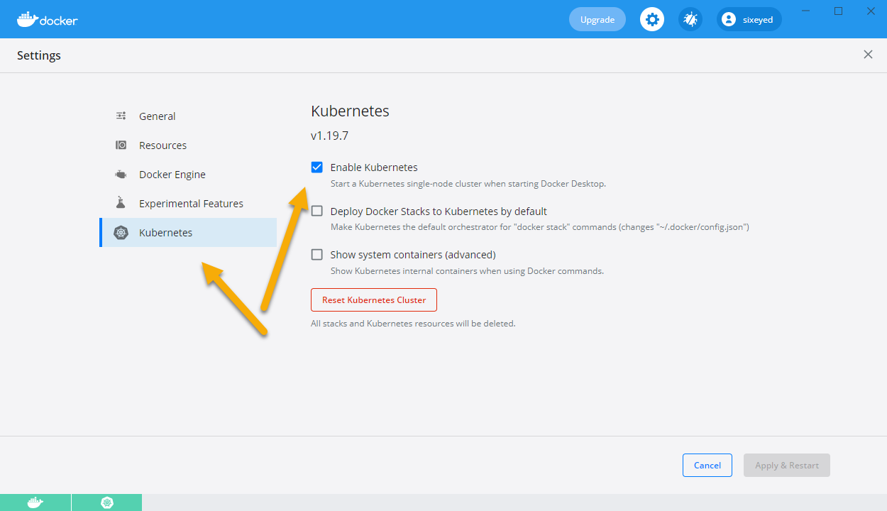 In the settings Windows select Kubernetes from the left menu and click Enable Kubernetes: